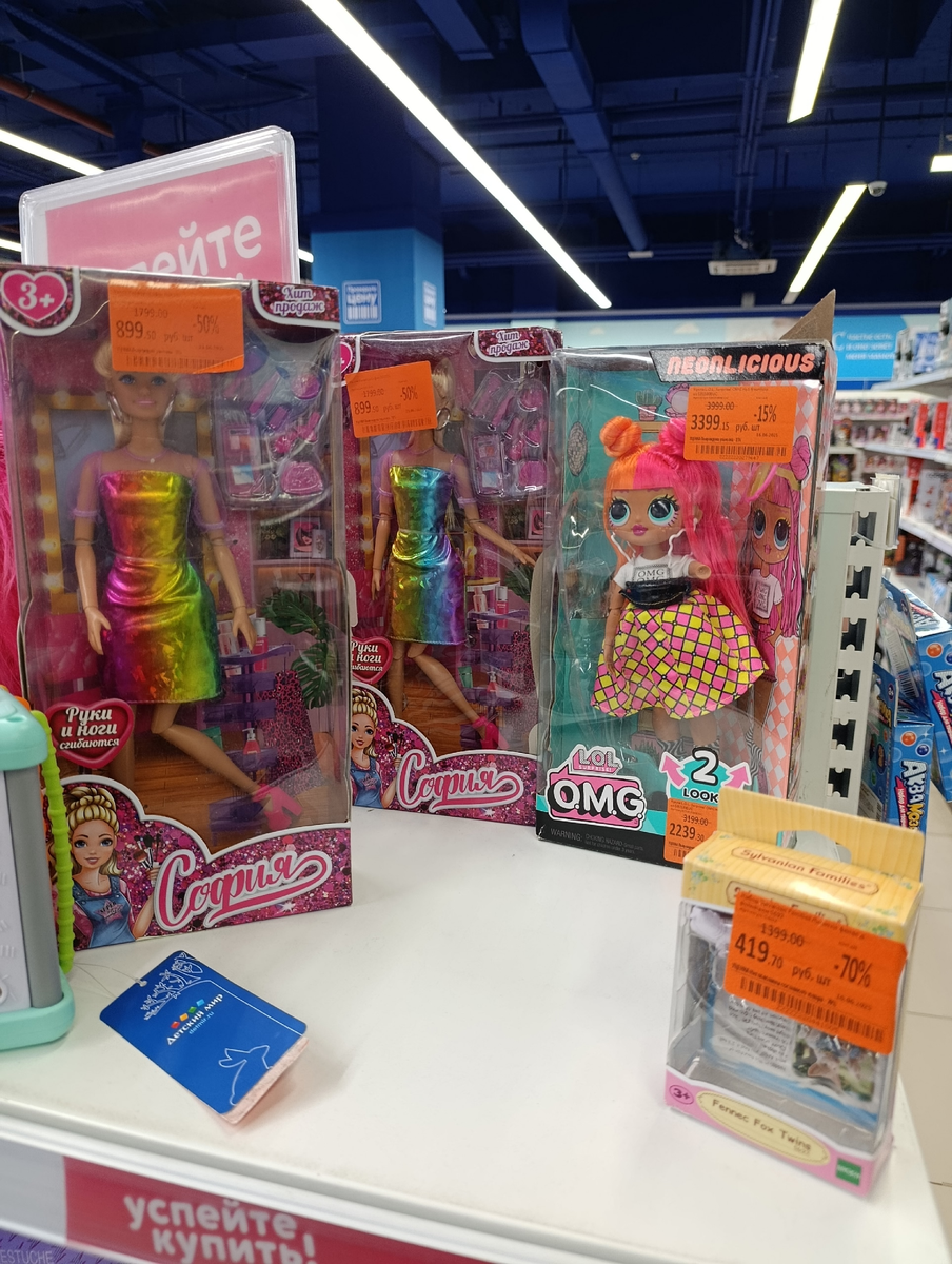 Жутковатые животные (нормальные тоже были, справедливости ради): Бабольки по справедливой цене! Удивительно! TY по цене почти в три раза выше, чем в магните: Уенсдей. Весьма симпатичная, надо сказать. Но дорого. Новые йоги по 2000: Новые фешенки в ту же цену. Эту серию я видела впервые. Не думала, что они настолько сильно отличаются от правычных линеек 1:6. Мне кажется закос под MGA Прикольная крошечная серия. Масштаб 1:32 наверное или даже меньше. Доя исключительных детей, потому что обычные (и я) тут же все растеряют.