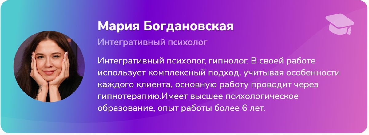 Мария Богдановская — интегративный психолог, гипнолог с более чем 6-летним опытом работы.