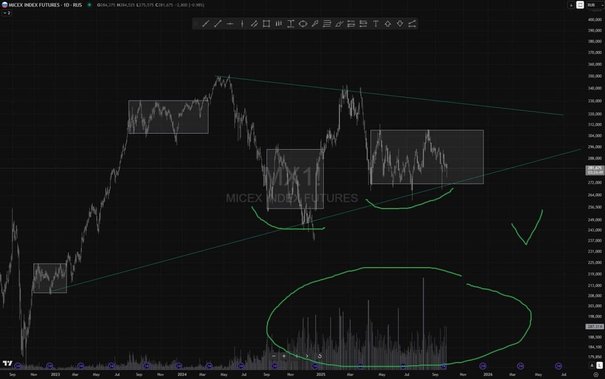 #аналитика 🇷🇺Очень уж Мне нравится текущее положение дел на нашем рынке. Видно большое накопление, с ростом объёма торгов. Кто-то копит хорошую позицию для распределения. Ждём теперь новостной фон - только с его ведома сегодня может что-то расти 📈