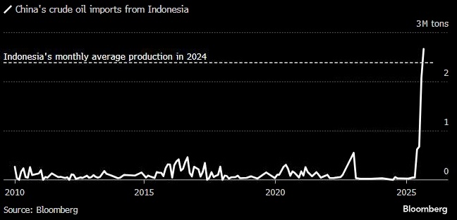 Власти КНР нашли очередной способ обойти санкции США. Китай зафиксировал резкий рост импорта индонезийской сырой нефти за последние два месяца, что высветило маловероятный маршрут, который предполагает появление новых обходных путей для экспорта иранской нефти — даже несмотря на давление со стороны США. По данным таможни, в прошлом месяце из Индонезии поступило в общей сложности 2,7 млн тонн сырой нефти, что эквивалентно примерно 630 000 баррелей в сутки. Этому предшествовал резкий скачок в июле, когда объёмы поставок утроились по сравнению с предыдущим месяцем. Индонезия — крупнейшая экономика Юго-Восточной Азии. Она импортирует нефть уже более двух десятилетий. Однако августовские закупки Китая значительно превышают прошлогоднюю добычу в Индонезии, составлявшую около 580 000 баррелей в день. Большая часть нефти потребляется внутри страны, где спрос приближается к 1,7 миллиона баррелей в день, согласно данным Управления энергетической информации. Импорт нефти в Китай из Индонезии резк