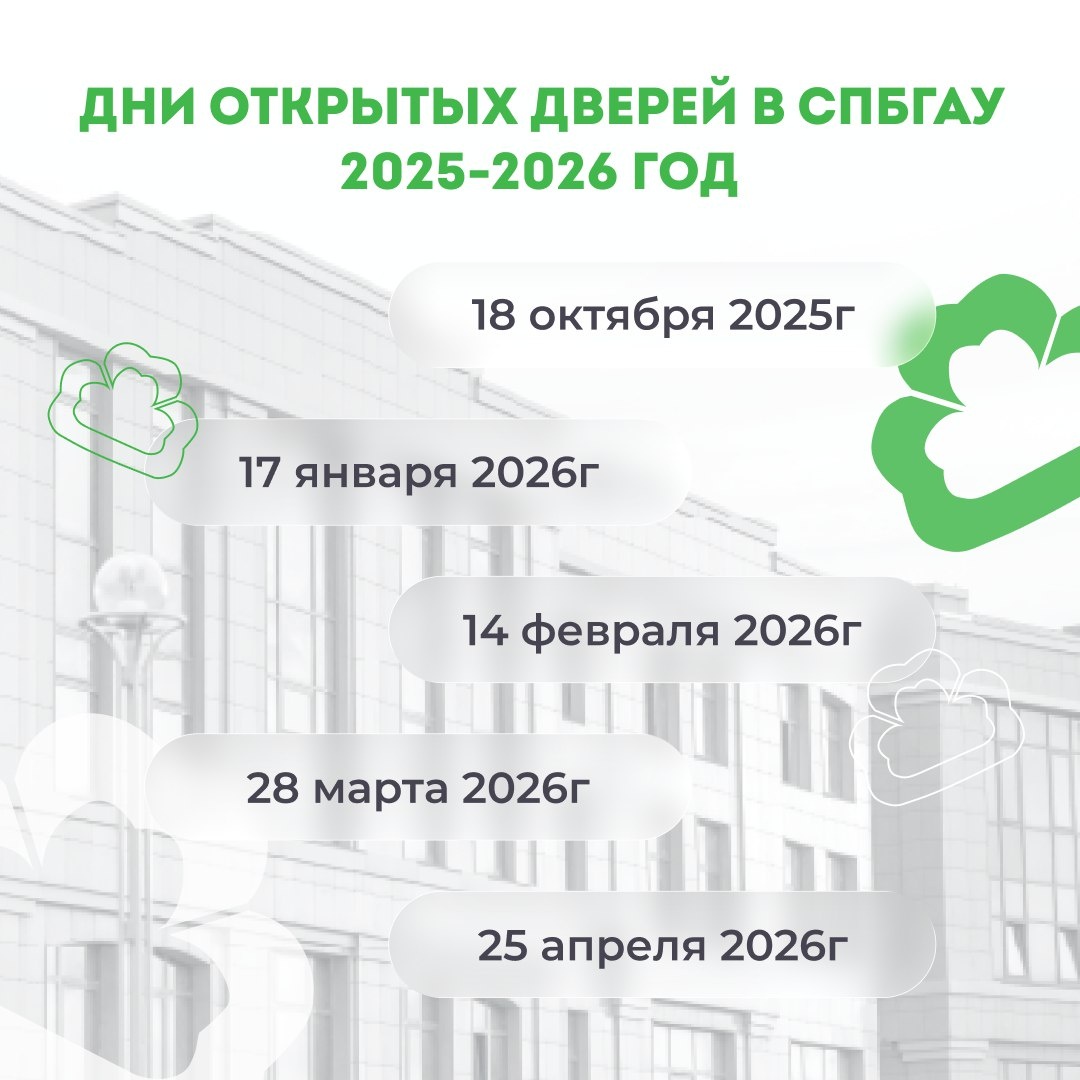 СПбГАУ приглашает на Дни открытых дверей! 🎓 Санкт-Петербургский государственный аграрный университет с радостью объявляет даты проведения Дней открытых дверей, которые станут отличной возможностью для будущих студентов познакомиться с вузом, его институтами, образовательными программами и студенческой жизнью! В программе Дней открытых дверей: 🔸 Приветственное слово от ректора и руководства университета. 🔸 Презентации колледжа и институтов. 🔸 Знакомство с актуальными образовательными программами и новыми направлениями подготовки. 🔸 Информация о правилах приема, вступительных испытаниях. 🔸Экскурсии по материально-технической базе вуза. 🔸Возможность задать все интересующие вопросы преподавателям, сотрудникам приемной комиссии и студентам. Дни открытых дверей будут особенно полезны выпускникам школ, колледжей, а также их родителям, которые хотят сделать осознанный выбор будущей профессии и учебного заведения. 👩🎓