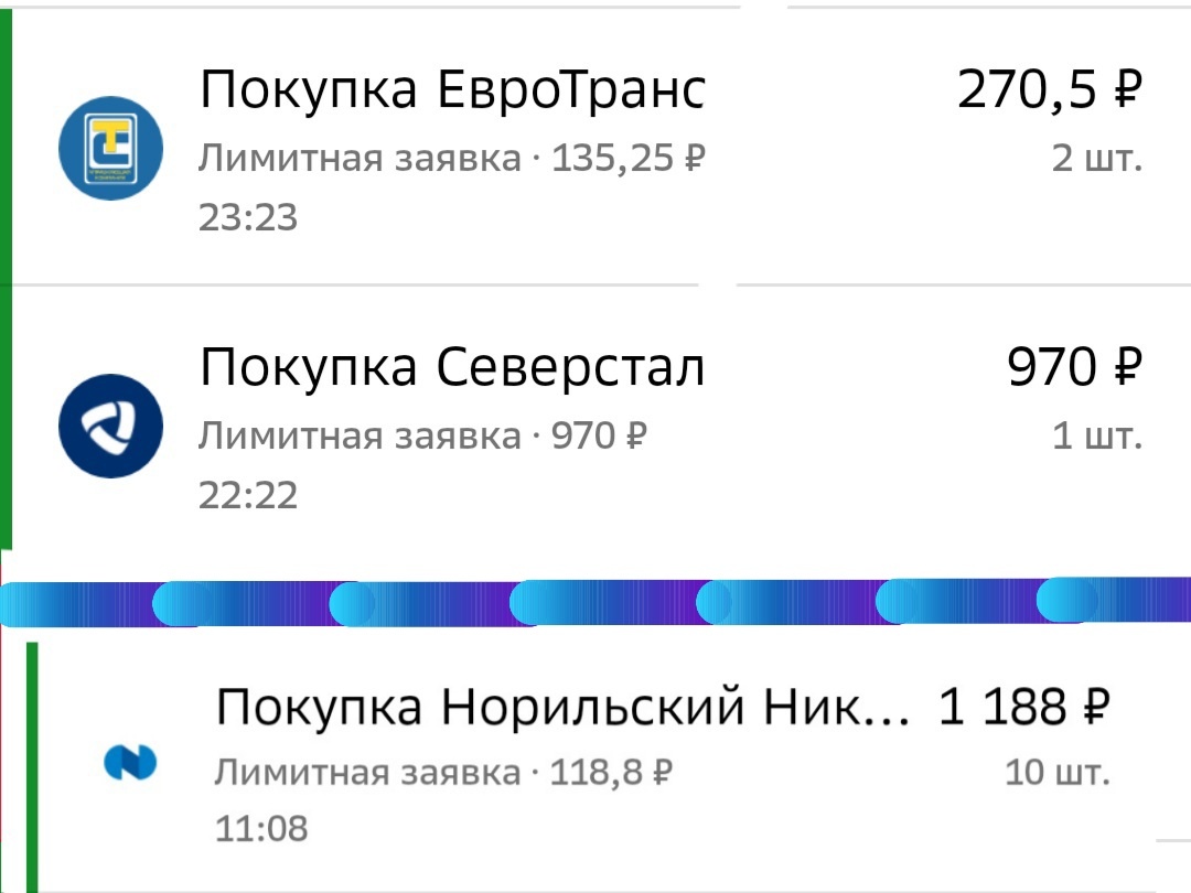 Изначально планировала на этой неделе только купить пару облигаций (первичное размещение). Но рынок вовсю падает на "геополитических" новостях, так что решила все же взять и акции. Цены снижаются хорошо, однако по многим эмитентам они все ещё ниже моей средней либо в целом выше моих ожиданий.Поэтому купила только: • Норникель 1 лот (новый эмитент в портфеле, давно хотела его добавить) • Северсталь 1 шт за 970 (отличная цена, а под конец торговой сессии вообще опустилась до 965,2!) • ЕвроТранс 2 лота (платит дивиденды несколько раз в год, ближайшие 6,02% к текущей цене, див.отсечка 20 октября). Откуда беру деньги на незапланированные покупки: из фонда от Сбера "Облигации с переменным купоном". Я в нем коплю средства на вот такие случаи, сейчас он у меня в плюсе, поэтому не жалко продавать паи для покупки акций. Ещё участвую в первичном размещении облигаций: • Миррико Кредитный рейтинг BBB- Купон постоянный, 21%, выплаты раз в месяц Колл-опцион через 1,5 года (эмитент может вык