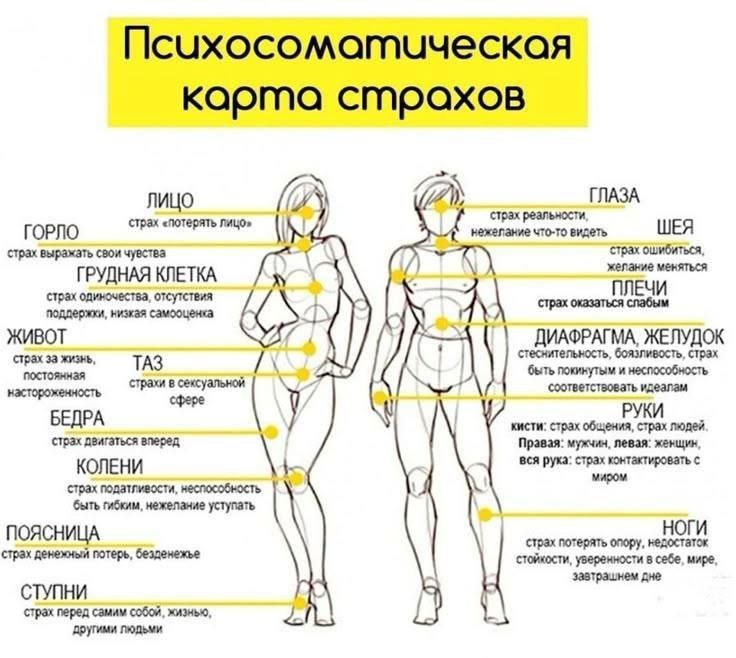 Где живет страх? Страх это базовая эмоция, нужная нам для выживания. И как любая эмоция, страх не витает в воздухе, "он живёт " в нашем теле. Основная локация страха - живот, однако, в зависимости от природы своего происхождения тело может говорить нам о каком-то конкретном страхе проблемами в разных частях тела. Так, например, страх высказывать своё мнение или выражать свои эмоции голосом, т.е. говорить об обиде, злости и т.д. может проявляться болезнями горла. А боль в шее может быть сигналом к тому, что вы боитесь ошибаться и идти в новое. Наше тело неразрывно связано с эмоциями и часто боль в той или иной части тела это сигнал обратить внимание на своё эмоциональное состояние. Это называется психосоматика. Если не обращать внимание на своё ментальное здоровье - страдает физиология. И , если не решить это на ранних стадиях, может перейти в хроническую форму. ЭОТ эмоционально-образная терапия работает с эмоциями и состочниями человека, поэтому буквально за 1-2 сеанса можно и