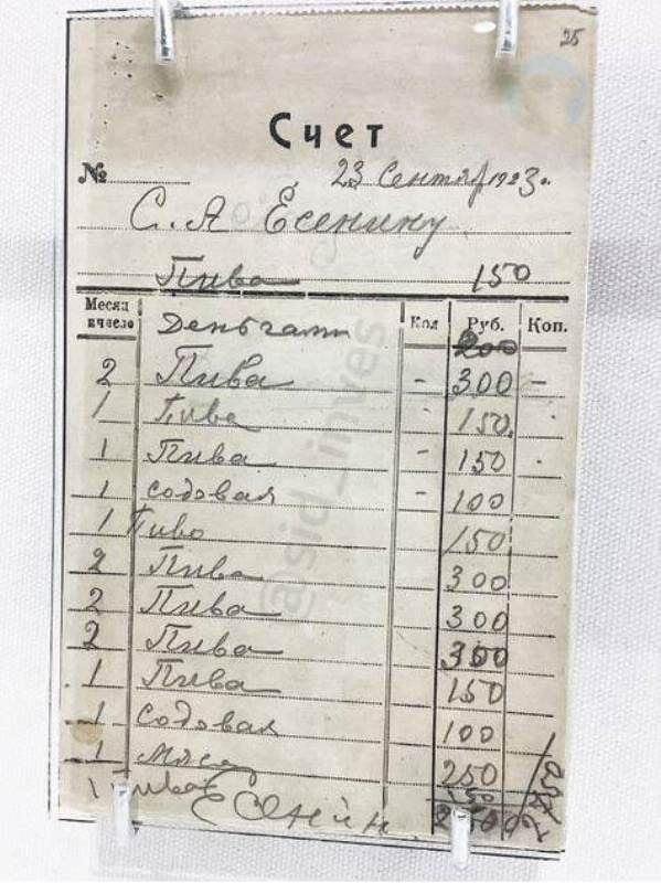 Этому счету из ресторана 102 года Клочок бумаги вековой давности раскрывает один вечер великого поэта. Sid_the_sloth принёс нам немного интересной инфы из истории. На фото счет Сергея Есенина из московского ресторана от 23 сентября 1923. Сегодня этому счету исполнилось ровно 102 года. 👉Цены в 1923 году Будем считать, что счёт подлинный — во всяком случае, опровержения в сети не найдено. Интересно, что именно в 1923 г., спустя 3 года гиперинфляции после Гражданской войны, в молодом СССР прошла вторая советская деноминация. 1 рубль нового образца (1923) приравнивался к 100 рублям образца 1922 г. и к 1 млн рублей всех прежних выпусков. 👉Для примера, цены в Москве в марте 1923 г.: ▪️Поездка на трамвае — 2 руб.; ▪️Приём у стоматолога — 2000 руб.; ▪️Меховое пальто — 1000 руб.; ▪️Билет в театр — 40 руб.; ▪️Зарплата бухгалтера треста Моссельпром за февраль 1923 г. — 1185 руб. Лечить зубы тогда, видимо, было очень дорого. Либо в источниках ошибка. Но к сентябрю инфляция выросла сильнее, т