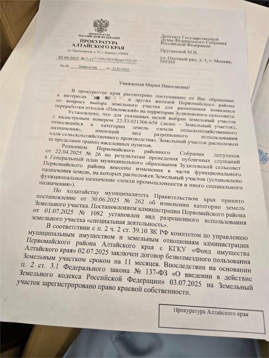Прокуратура Алтайского края ответила на запрос депутата Госдумы, первого секретаря Алтайского крайкома КПРФ Марии Прусаковой по поводу возможного строительства «мусорного завода» в окрестностях села Зудилово. До этого несколько сот жителей Первомайского района обратились в приемную Марии Николаевны, обеспокоенные новыми планами властей по переносу «мусорной стройки» из Павловского в Первомайский район. Судя по ответу надзорного ведомства, районные и краевые власти действительно оперативно успели переоформить земельный участок под будущий «мусорный завод». Но под вопросом основание для такого переоформления - публичные слушания. В настоящее время в краевом суде рассматривается административный иск об оспаривании результатов публичных слушаний и признании решения Первомайского районного Собрания депутатов недействительным. Сейчас оценка законности документов территориального планирования, а значит и перспектива «мусорного завода» на выбранном участке под Зудилово, будет зависеть от су