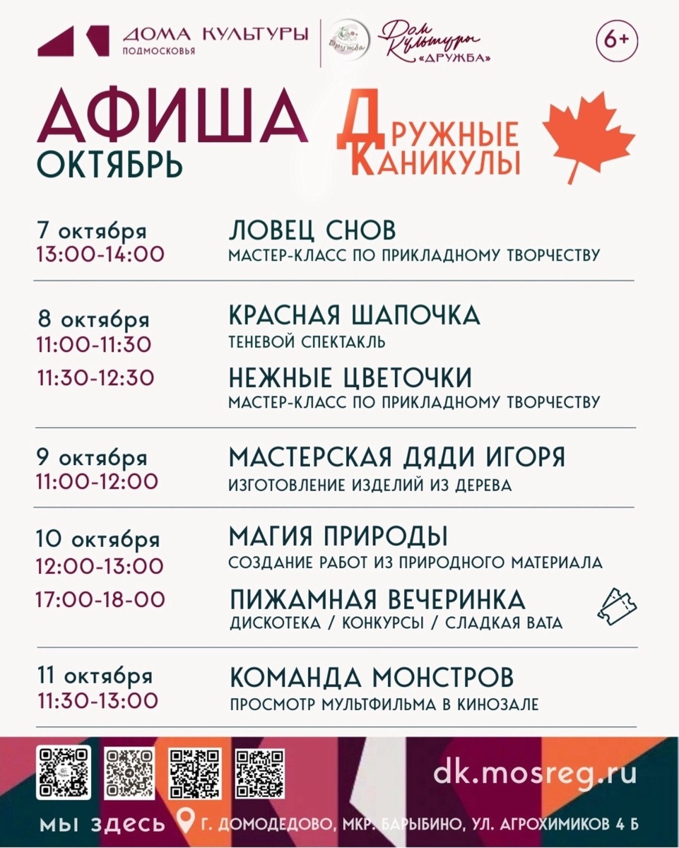 ✨ 🫶 ДРУЖНЫЕ КАНИКУЛЫ 🫶 📍 АФИША 🔖 7 ОКТЯБРЯ 13:00 - ЛОВЕЦ создание увлекательного амулета 🎟️ б е с п л а т н о / по записи 🔖 8 ОКТЯБРЯ 11:00 - Теневой спектакль 🔖 8 ОКТЯБРЯ 11:30 - НЕЖНЫЕ ЦВЕТОЧКИ мастер-класс по прикладному творчеству 🎟️ б е с п л а т н о / МК по записи 🔖 9 ОКТЯБРЯ 11:00 - МАСТЕРСКАЯ ДЯДИ ИГОРЯ создание изделий из дерева 🎟️ б е с п л а т н о / по записи 🔖 10 ОКТЯБРЯ 12:00 - МАГИЯ ПРИРОДЫ 🎟️ б е с п л а т н о / по записи 🔖 10 ОКТЯБРЯ 17:00 - ПИЖАМНАЯ ВЕЧЕРИНКА дискотека / конкурсы / сладкая вата 🎫 400 руб. / дресс код - пижама + подушка 🔖 11 ОКТЯБРЯ 11:30 - КОМАНДА МОНСТРОВ 🎟️ б е с п л а т н о 🏢 Городской дом культуры «Дружба» 📍 г.о. Домодедово, мкрн.Барыбино, улица Агрохимиков, д.4Б ✅ Мероприятия Домодедово https://dzen.ru/id/66f10385cc4c5a16f7b5fb02 http://vk.com/domodedovo_events http://dzen.ru/domodedovo_events