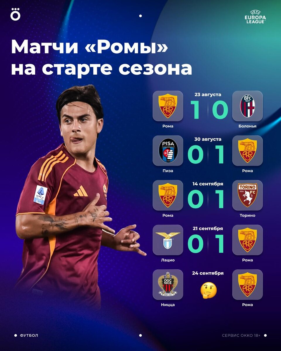 1:0, 0:1, 0:1, 0:1. Это не двоичный код, а матчи «Ромы» на старте сезона 🤯 Три победы со счетом 1:0 и поражение от «Торино» 0:1. Какая-то новая установка от Гасперини? ⚡️ Сегодня римляне сыграют против «Ниццы» в первом туре ЛЕ. Смотрим в 22:00 вместе с Владимиром Стогниенко: https://okko.tv/s/tw3