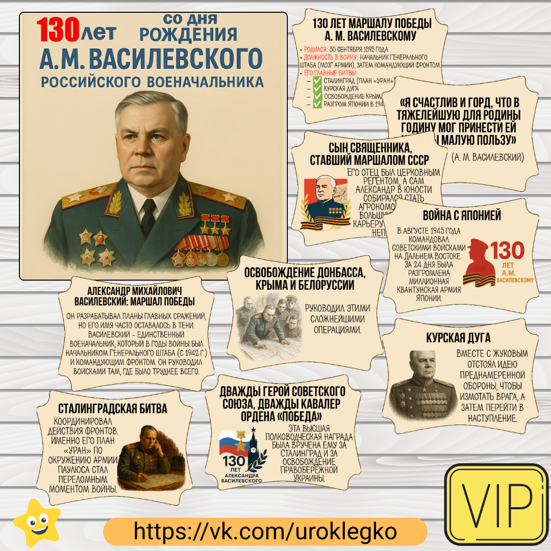 Оформление, посвящённое 130-летию со дня рождения Маршала Советского Союза А.М. Василевского, понадобится школе для проведения содержательного и визуально привлекательного патриотического мероприятия, цель которого — познакомить учащихся с жизнью и выдающимся вкладом одного из величайших полководцев Второй мировой войны. Яркий плакат формата 60х60 см или собранный из листов А4 станет смысловым центром экспозиции, привлекая внимание и создавая торжественную атмосферу, а девять информационных листов предоставят школьникам развернутые факты о деталях биографии Василевского, его ключевых операциях (таких как Сталинградская битва и разгром Квантунской армии) и роли в Великой Победе, что позволит углубить знания по истории и сформировать уважение к героическому прошлому страны. Где можно с