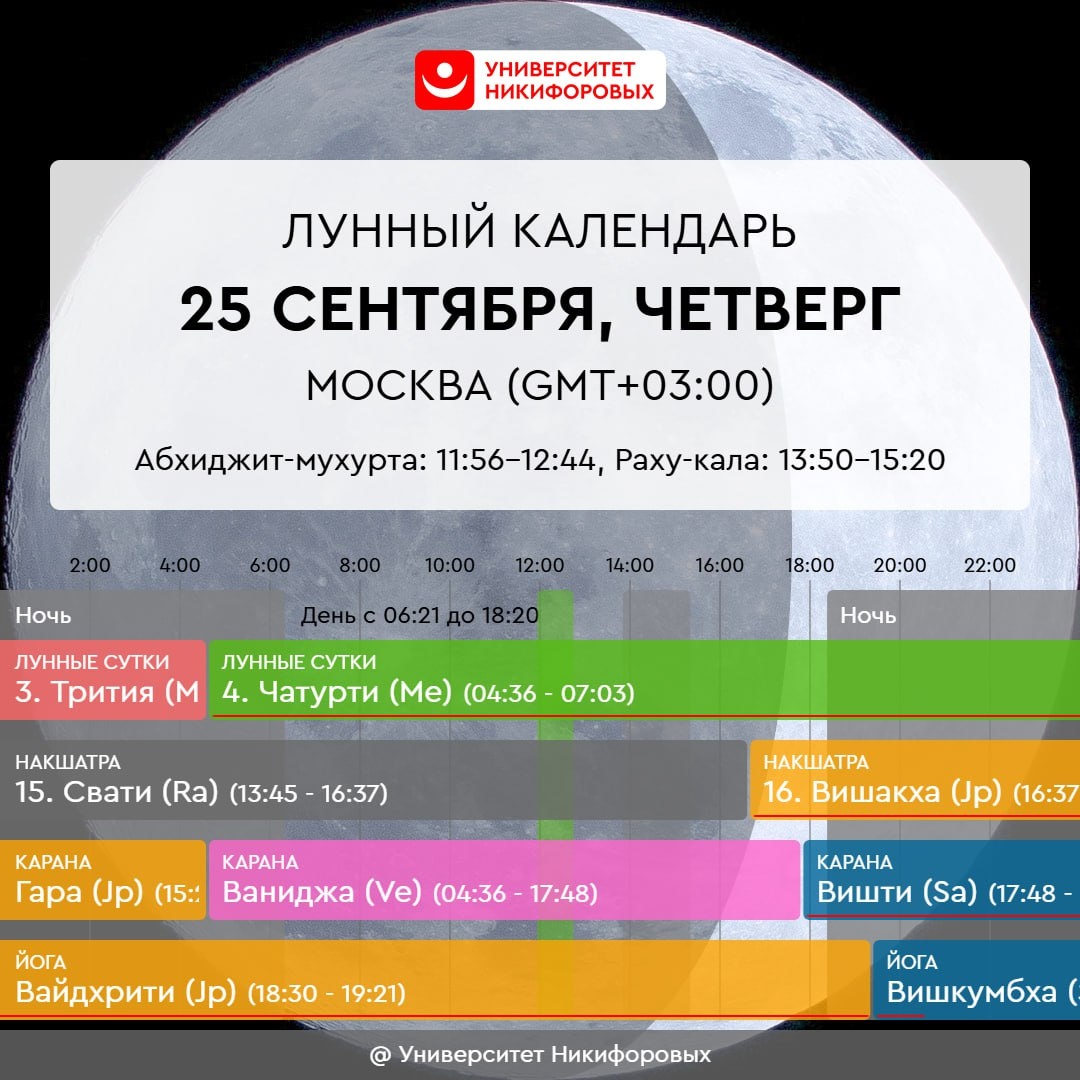 25 СЕНТЯБРЯ, ЧЕТВЕРГ Энергетика дня динамичная, но не самая благоприятная. Сегодня стоит сосредоточиться на рутинном и продолжении начатого ранее – время не поддержит новое и важное. Лучше направить свои усилия на доведение до ума текущих задач и укрепление того, что уже запущено. Хорошо уделить время наведению порядка в книгах и записях, касающихся саморазвития и духовности — организуйте их так, чтобы нужные материалы всегда были под рукой и вдохновляли вас на новые открытия. Приведите в порядок алтарь и религиозную атрибутику, удалите всё, что отвлекает, и оставьте только те предметы, которые имеют для вас глубокое значение. Сегодня замечательный момент, чтобы выражать почтение Ганеше – повелителю и устранителю препятсвий. Можно слушать мантры ему, можно повторять их, прося Ганешу облегчить вашу жизнь, устранить проблемы и сложности. Сегодня четвертый день Наваратри — это время поклонения богине Кушманде. Она – четвертая манифестация Дурги. Почитание этой богини приносит долголе