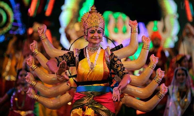 · Запад (Гуджарат, Махараштра): Здесь главный символ — гарба и дандия. Люди образуют круги и, двигаясь по солнцу, исполняют танец вокруг горшка (гарба) с горящей лампадой внутри, символизирующей божественную матку, источник жизни. Звон палочек (дандия) отбивает ритм сотворения мира.