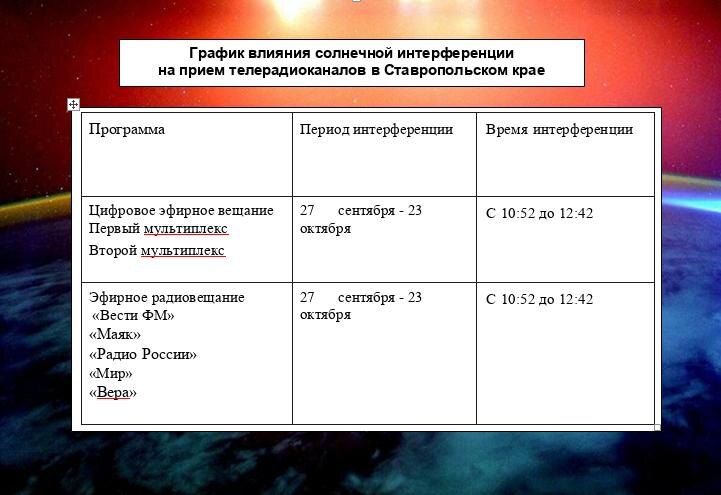 В небе над Ставропольем в период с 27 сентября по 23 октября 2025 года будет наблюдаться осенняя интерференция, когда радиоволны Солнца влияют на приём телесигнала со спутника. Об этом сообщают в краевом минпроме. Осенью Солнце может находиться на одной линии со спутником связи и земной станцией, что может привести к незначительному ослаблению сигнала. В Ставропольском крае такое совпадение возможно с 10:52 до 12:42 часов. Однако цифровые технологии PTPC сводят воздействие солнечной интерференции (солнечной засветки) к минимуму. В Ставропольском филиале ФГУП «Российская телевизионная и радиовещательная сеть» отмечают, что большинство зрителей не заметят изменений в качестве изображения. Возможны лишь кратковременные сбои, такие как «замерзание» изображения или его распад на пиксели. Вопросы о цифровом эфирном телевидении можно задать по горячей линии РТРС: 8-800-220-20-02. График влияния солнечной засветки на телеприем доступен на сайте ртрс.рф и в мобильном приложении «Телегид». © "Ве