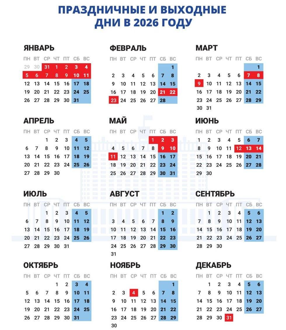 Правительство РФ утвердило график праздничных и выходных дней на 2026 год