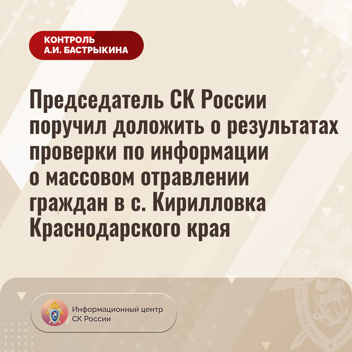 Председатель СК России поручил доложить о результатах проверки по информации о массовом отравлении граждан в с. Кирилловка