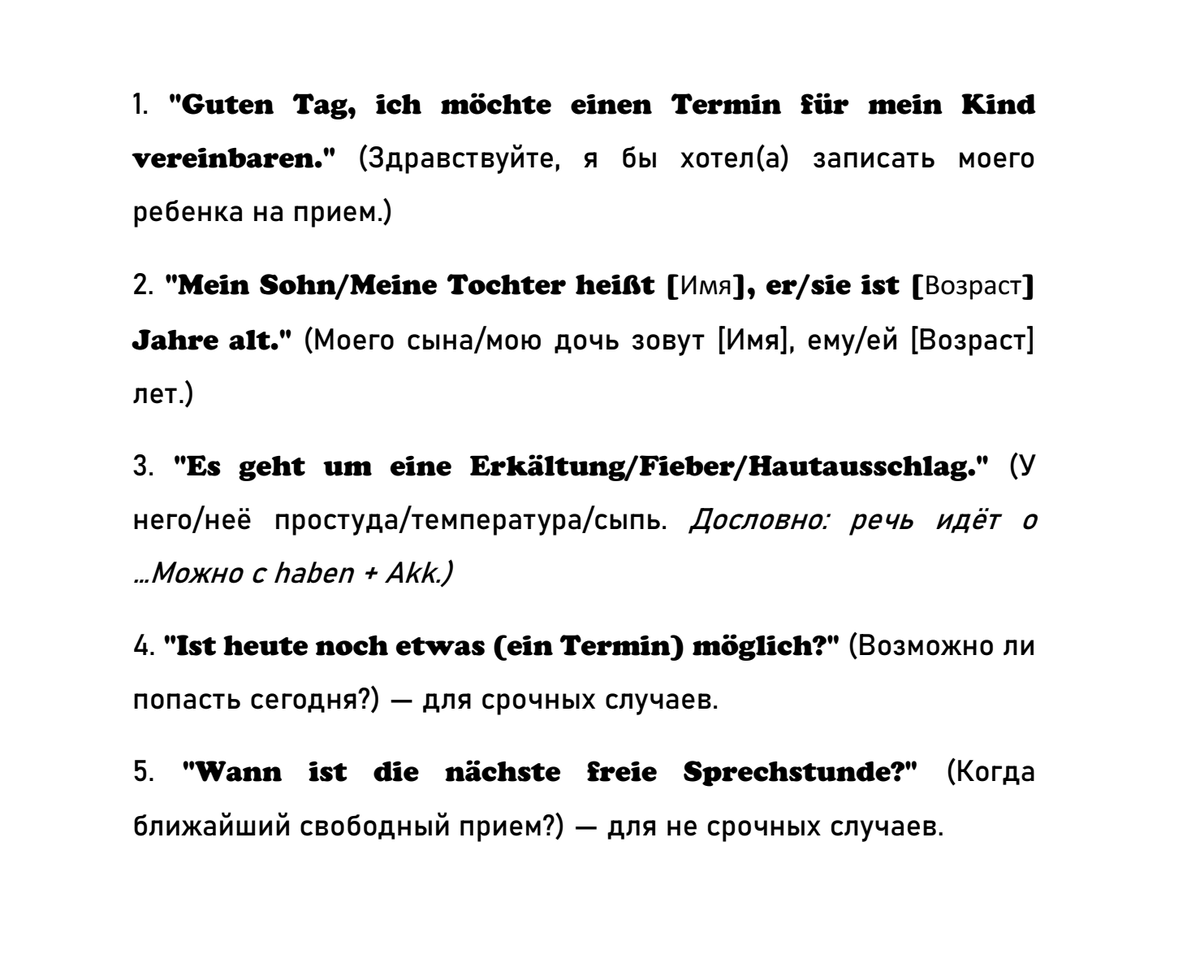 Поход к врачу с ребенком в чужой стране, да еще и на другом языке - ох, что может быть лучше? Но хорошая подготовка может немного снизить градус тревоги. Заглядывайте в подборку "Немецкий для родителей". Там уже есть, что почитать, а будет ещё больше. Итак, рано или поздно вам предстоит визит к местному педиатру — der Kinderarzt. В Германии у каждого ребенка должен быть свой педиатр, к которому вы прикрепляетесь (или просто выбираете). Это ваш первый и главный контакт по всем вопросам здоровья — от простуды до плановых осмотров (Vorsorgeuntersuchungen - Pl.). Важно: Если случай экстренный (высокая температура, сильная боль, травма), звоните в Notdienst (скорая помощь) или поезжайте в ближайшую Notaufnahme (приемное отделение больницы). Первый барьер — это телефонный звонок. Не откладывайте запись, особенно если нужен плановый осмотр или вы подозреваете что-то серьезное. ▎Ключевые фразы для записи: Совет: Если вам сложно говорить по телефону, попросите кого-то из знакомых немцев помочь