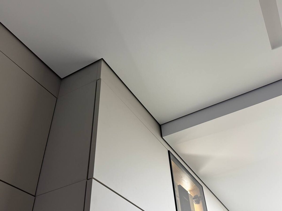 Это строгие углы в 90 градусов. Отступ от стены 0,8 мм. Почему получаются строгие углы? Да потому что каждый угол запиливается торцовкой, потом еще подрабатывается напильником и двухкомпонентным клеем по нужде. Тот ещё гемор, но того стоит. Эстетика теневых систем.