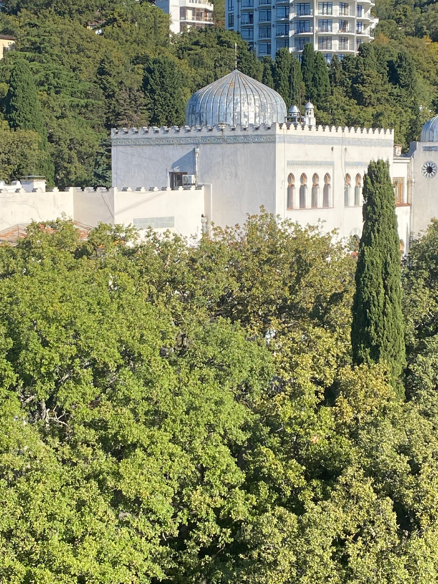 Дворец по форме напоминает букву Е и архитектор Краснов идеально вписал его в сложный горный рельеф.