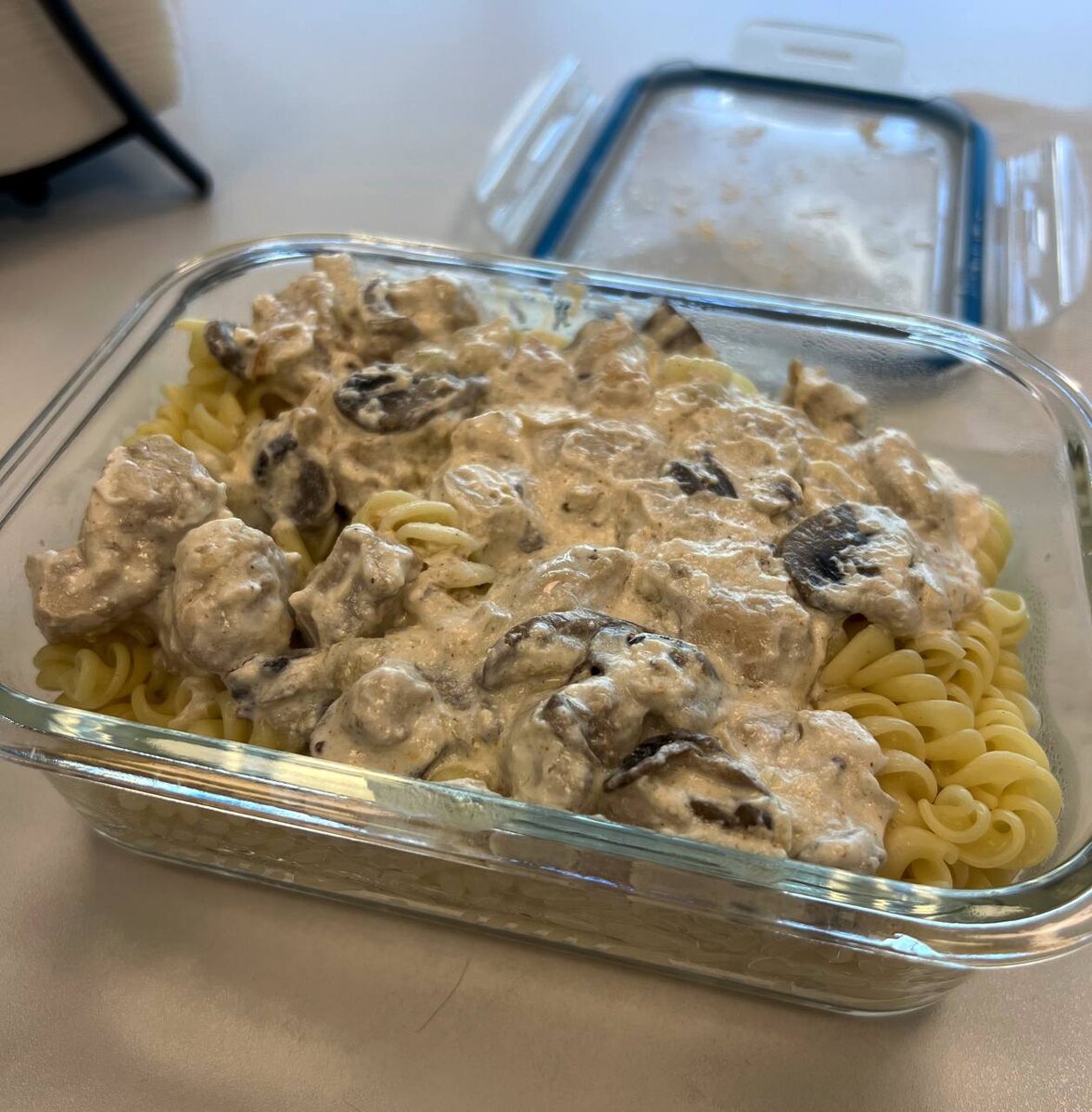 Макароны с тушеной куриной грудкой и грибами в сливках. Если нужно, могу дать рецепт 🧾