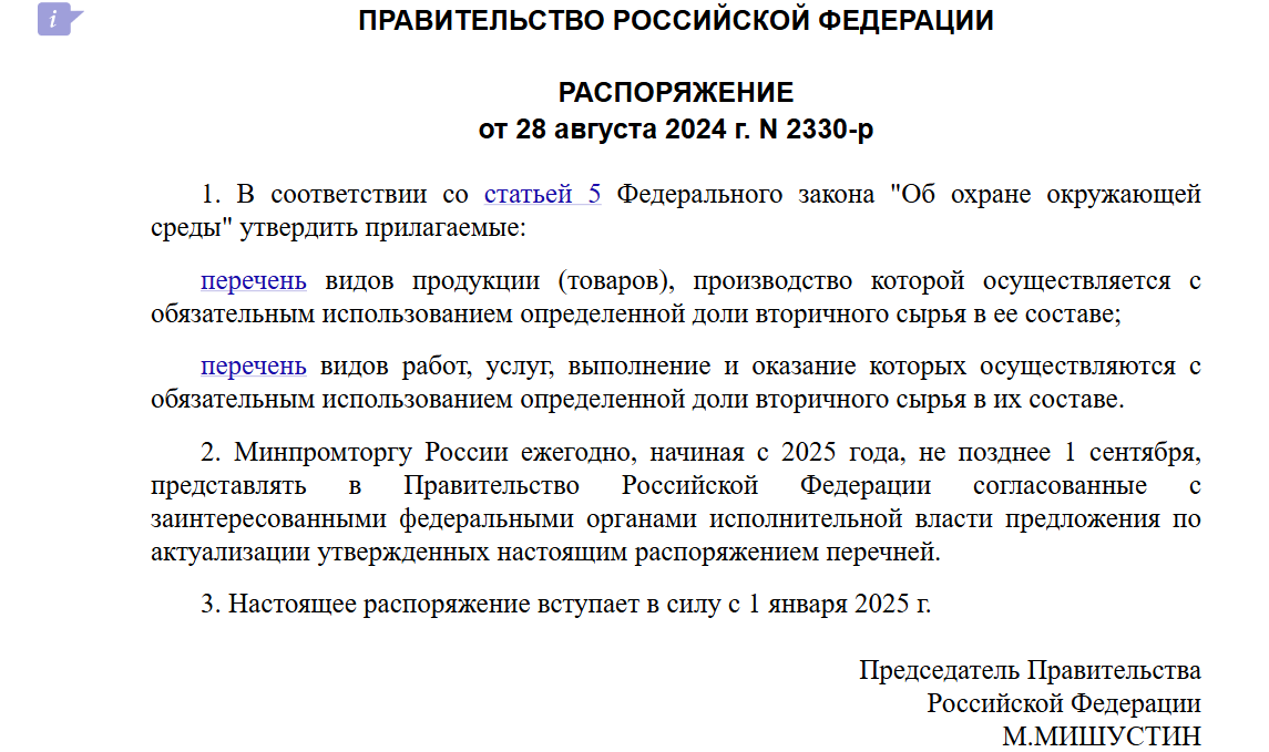 Реализовав свое право, Правительство РФ в распоряжении №2330-р утвердило перечни таких товаров, работ и услуг, производство, выполнение и оказание которых с 1 января 2025 года обязательно должно происходить с использованием определенной доли вторичного сырья в их составе.