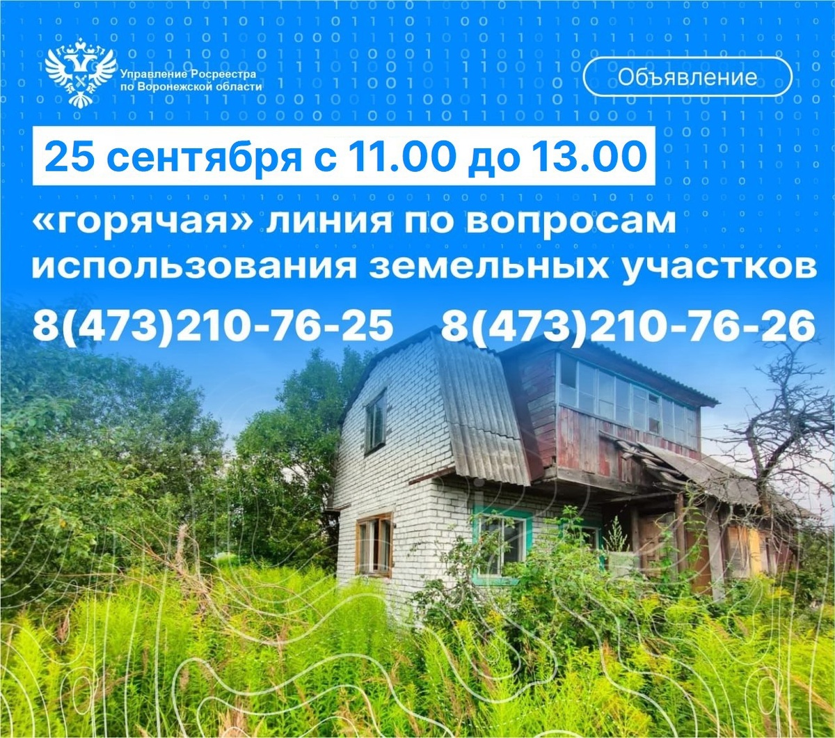 25 СЕНТЯБРЯ ВОРОНЕЖСКИЙ РОСРЕЕСТР ПРОКОНСУЛЬТИРУЕТ ПО ВОПРОСАМ ИСПОЛЬЗОВАНИЯ ЗЕМЕЛЬНЫХ УЧАСТКОВ