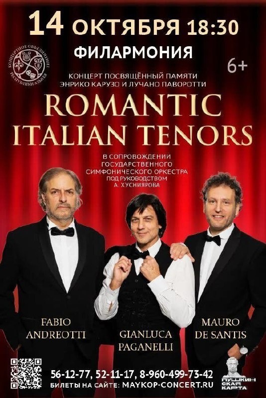 🎵14 октября в 18:30 в Большом зале Филармонии Концертного объединения Республики Адыгея совместно с Государственным симфоническим оркестром Концертного объединения Республики Адыгея выступят молодые, всемирно известные итальянские теноры Джанлука Паганелли, Фабио Андреотти и Мауро Де Сантис. Этот концерт посвящен памяти легендарных Энрико Карузо и Лучано Паваротти. 👥Артисты исполнят шедевры оперной музыки, неаполитанские песни и популярные мелодии со всего мира. Главный дирижер – народный артист Республики Адыгея Аркадий Хуснияров. Художественный руководитель оркестра – заслуженный артист Российской Федерации Андрей Семенов. Ведущая – лектор-музыковед Зарема Хакуй. Билеты по ссылке #новости_минкульт_РА #КОРА #РеспубликаАдыгея #Победа80