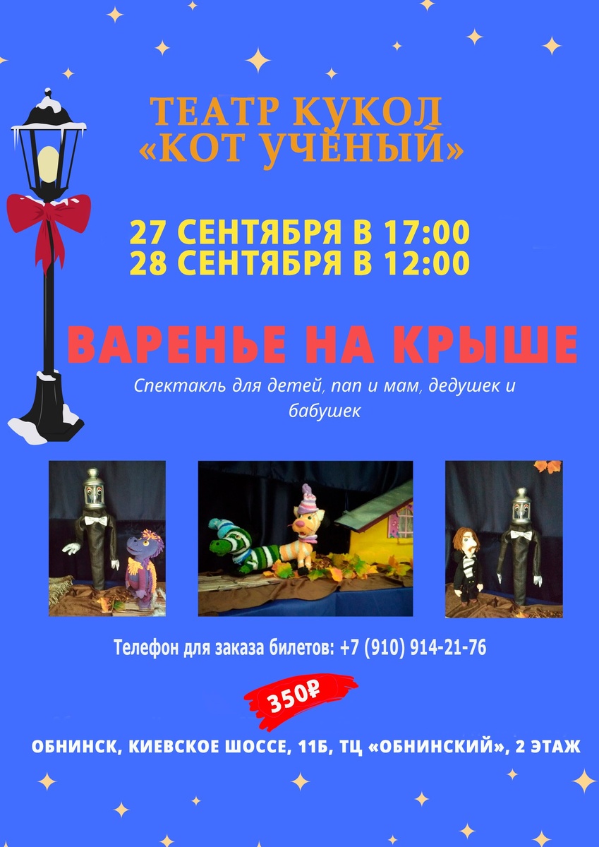 Театр кукол «Кот Учёный» | Обнинск приглашает на спектакль «Варенье на крыше» (5+). ▪27 сентября в 17:00 ▪28 сентября в 12:00 🔦Эта странная история произошла в одном сказочном городе, где вместе живут и люди, и животные. А уличные фонари сами ходят и разговаривают. Все жители любят свой город и следят за порядком. Но вот случилось так, что все делалось «как положено», а варенье оказалось на крыше дома Дракоши. И тут такое началось! 🍯Варенье оказалось очень липким, а Фонарщик излишне мечтательным, а господин Фонарь... Всё не расскажешь. Надо смотреть! 💰350₽ вне зависимости от возраста и на каждого зрителя. 🎟 +7 (910) 706-95-05/+7 (910) 914-21-76. 🚩Обнинск, Киевское шоссе, 11Б, ТЦ «Обнинский», 2 этаж 👍 Подписаться | Ваша реклама