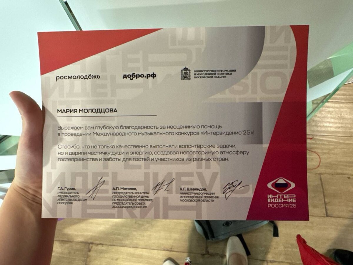 Ну и в завершении моего длинного рассказа о том что, на следующий после финала Интервидения 21 сентября организаторы «Интервидения 2025» для всех волонтеров, сопровождавших это мероприятие устроили праздник, на котором выразили благодарность всем службам.😌 Мы ночевали после финала в отеле, после чего когда проснулись утром 21 числа Фнас пригласили в Медиацентр «Сколково» для награждения.😌 Перед началом празднования всех волонтеров ждал невероятно красивый и вкусный фуршет, где были вкуснейшие сендвичи, фруктовые салатики, десерты, чай, кофе и лимонад🥰 Перекусив, мы отправились в зал.😌 Высокопоставленные гости мероприятия говорили такие теплые слова благодарности всему волонтерскому корпусу, что я почувствовала себя на этом празднике очень значимой🥹 ведь все прошло замечательно.🥰 Менеджерам и тимлидерам вручили благодарности, цветы и подарки.😌 Каждого волонтера наградили благодарственными письмами, а также нам подарили памятные подарки: портативную колонку, силиконовую бутыло