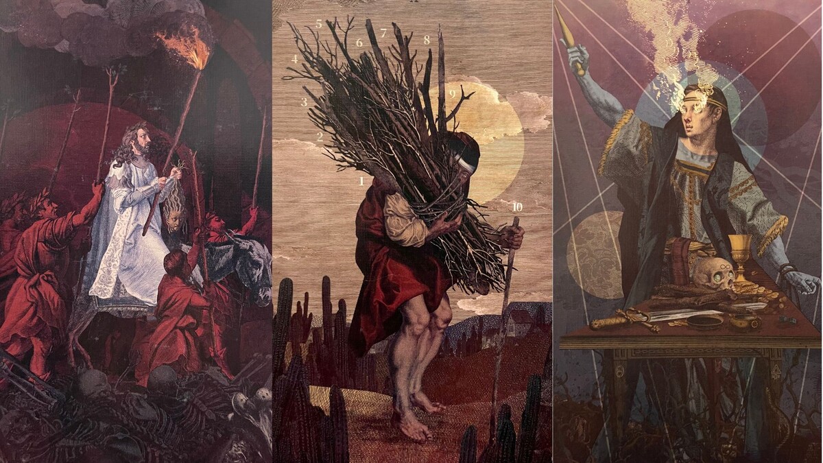 Карты двора - это могут быть вполне конкретные люди. Например, Королева жезлов - властная, активная, неуступчивая, самоуверенная коллега. Или просто потребуется очень много личной инициативы. Рыцарь мечей - конфликтный мужчина, спорщик ради споров, фанатик, явно создающий проблемную атмосферу. Смерть - выгорание, уход, неприятная личностная трансформация (впрочем, когда это они были приятными?), прощание с отжившей частью себя. Может, благодаря этим людям. А учитывая Христа с отрубленной головой на первой фотке - может, и вовсе предательство.