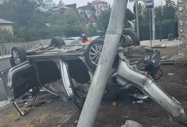 «Фольксваген» перевернулся и вылетел с дороги в Воронеже после ДТП с внедорожником