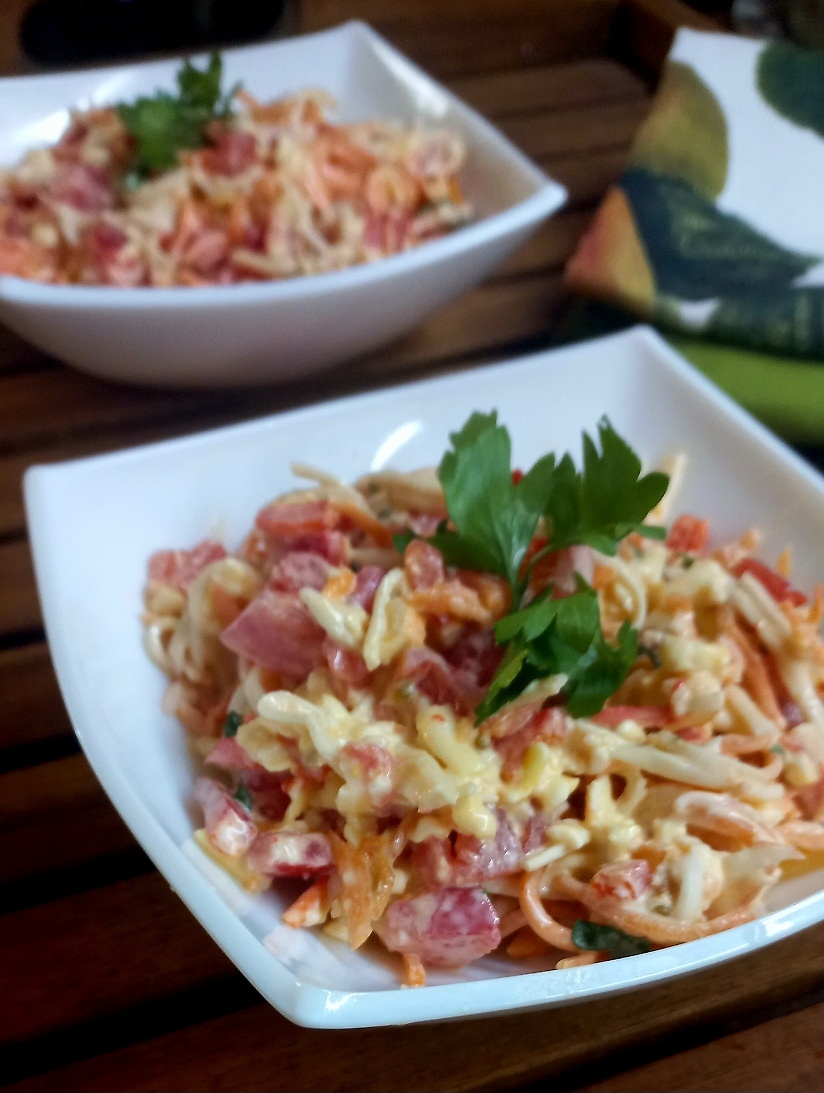 Это альтернатива крабовому салату "Коралловый" или Красное море", который так полюбился моей семье Салат лёгкий и в то же время сытный. Непременно попробуйте приготовить его с колбасы сыром. Его копченый аромат и вкус внесёт свой лёгкий шарм. Прежде всего выдавливаем очищенный чеснок через пресс и соединяем с майонезом. Пока готовим все ингредиенты для салата, майонез пропитае тся чесноком - отдаст ему вме свои качества. Вобщем-то приготовление почти моментальное, потому что используем уже нарезанные готовые овощи: морковь по-корейски, кукурузу. На крупной тёрке нам необходимо натереть сыр. Болгарский перец моем, затем разрезаем и удаляем семейную коробочку. После этого нарезаем его тонкими ломтиками произвольной формы: полосками или кубиками. Крабовые палочки я люблю разделывать на тонкие полоски. К слову сказать, что не все Крабовые палочки можно так разделать. В противном случаем нарезаем кубиками. Моем петрушку, кладем её на бумажное полотенце. Через пару минут нарезаем её.