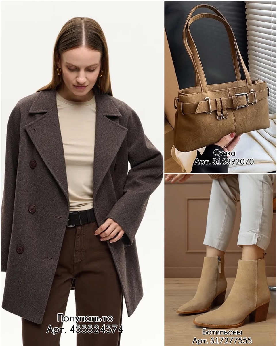 Тёплая нейтральная палитра делает образ «дорогим» без усилий. В этой подборке — два готовых комплекта в оттенках кофе и карамели. Каждый предмет разобран отдельно: посадка, фактура, с чем носить и как «подружить» между собой. Идём строго по порядку с артикулами. Образ 1. Мягкий графит и песок Артикул: 455524574 Прямой силуэт с лёгким оверсайзом, крупные лацканы, двубортная застёжка на тёмные пуговицы. Плотный смесовый материал держит форму, не «заламывается» в плечах. Длина до середины бедра — оптимально и для юбок, и для брюк. Карманы вертикальные, посадка по плечу мягкая, что даёт благородный драп. Как носить. На тонкий джемпер или лонгслив, поверх пиджака, с джинсами прямого кроя или брюками из костюмной ткани. Совет стилиста. Застёгивайте только верхнюю пуговицу и делайте полузаправку свитера — вертикаль вытянет силуэт и подчеркнёт талию. Артикул: 316392070 Структурированная модель тёплого песочного оттенка. Главная деталь — декоративный ремень с пряжками по верху: добавляет графи