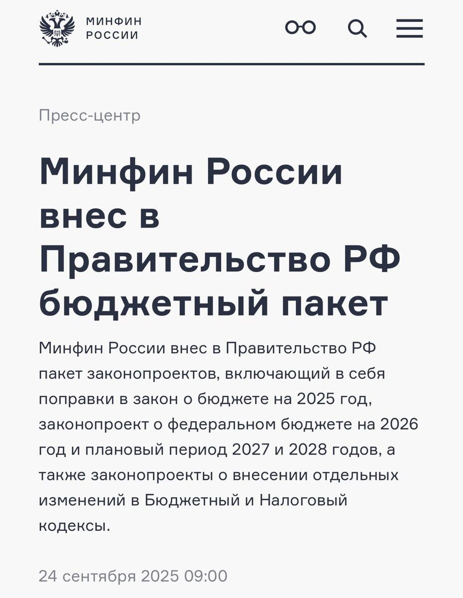 Всем добрый вечер. А может и не добрый. Пока не понятно, но не наводим панику. Сегодня я полдня отвечала на вопросы, это уже решение или обсуждение, это уже принято, это правда?!… Скажу точно, что это еще законопроект. И все очень надеемся, что в части дохода для упрощенцев на НДС, страховых взносов и НДС НЕ ПРИМУТ🚫 Ниже скидываю ссылку для ознакомления https://minfin.gov.ru/ru/press-center/?id_4=39932-minfin_rossii_vnes_v_pravitelstvo_rf_byudzhetnyi_paket P.S. В случае принятия, поправки в Налоговый кодекс РФ вступят в силу с 1 января 2026 года.