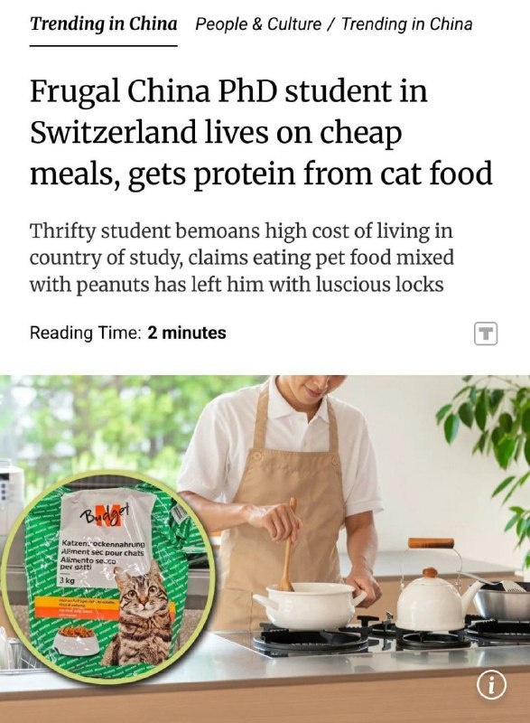 Китайский студент переехал в Швейцарию учиться и внезапно открыл для себя новый рацион — кошачий корм