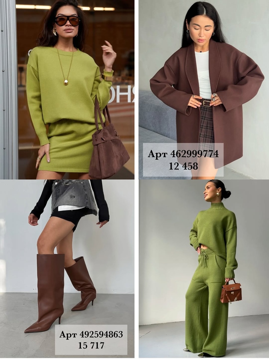 Сочетание зелёной оливы и глубоких шоколадных тонов — один из самых благородных дуэтов осени. Он работает и в повседневных луках, и в выходных, подчёркивает цвет кожи и делает вещи визуально «дороже». Ниже — готовая капсула по фото: рассказываю строго по порядку артикулов, разбираю каждую находку и даю точные советы стилиста.