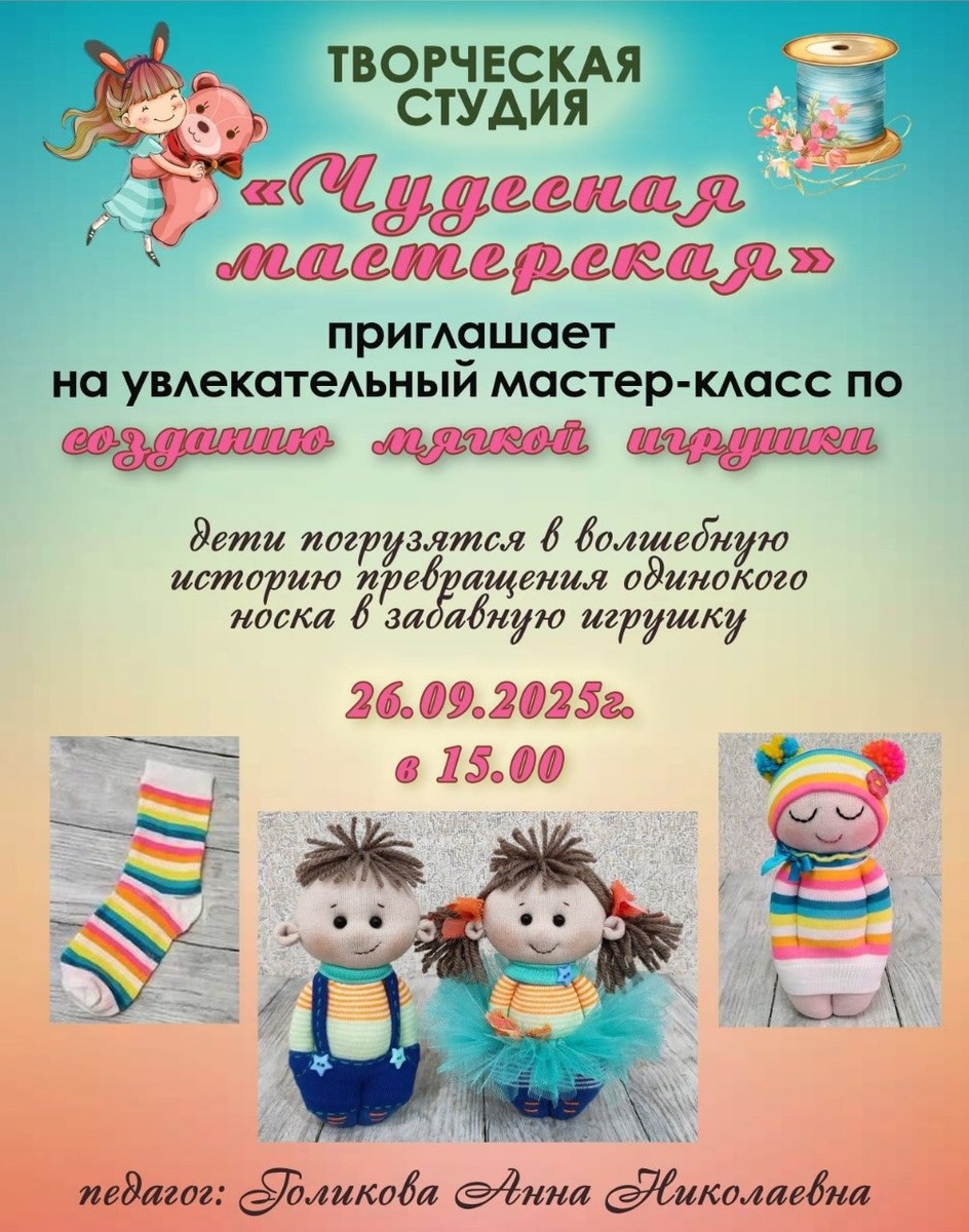 🙌 Уважаемые родители, приглашаем Вас и Ваших детей на мастер-класс по созданию мягкой игрушки «Чудесная мастерская