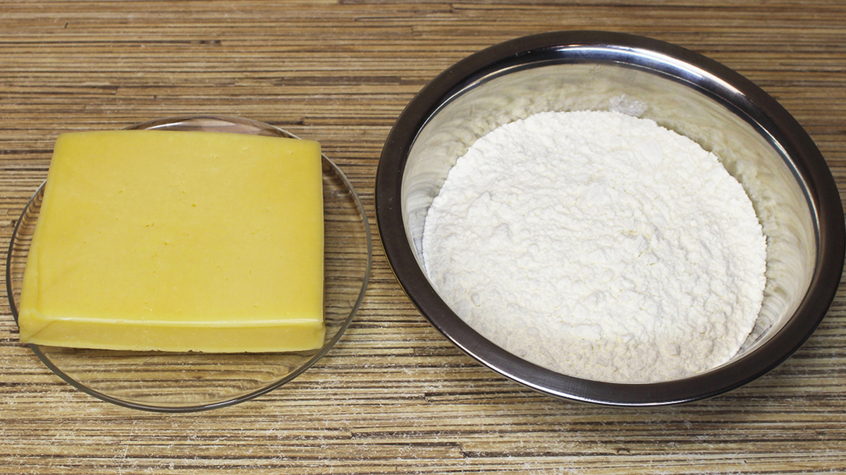 Добавьте кубики холодного сливочного масла в миску к муке и сыру.