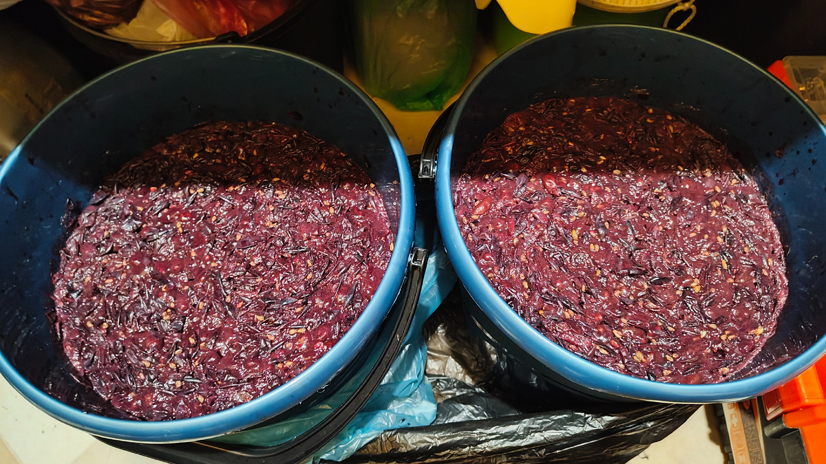 Пересмотрел уйму статей и видео из интернета, но так и не нашёл дельного рецепта вина из Изабеллы. Везде разные сведения, все по разному говорят. Буду учиться на своём опыте. Что я сделаю... У меня было примерно 30 кг. винограда. Сахар он до конца не набрал, конечно, но уже спелый. Привёз его, сутки он полежал, потом я его отделил от веточек, закинул в 12 литровые ведра, купленные а фикс прайсе, и хорошенько помял руками. Так, чтоб раздавить все ягоды. Получил литров по 10 в двух ведрах мезги - давленых ягод. На ягодах есть дикий грибок, и теперь задача, чтобы мезга на нём начала бродить. Выдержу её 4 суток, два раза в день хорошенько перемешиваю. Накрыл всё это дело чистой тряпочкой от мух. Продолжение следует... #вино #Изабелла #домашнеевино