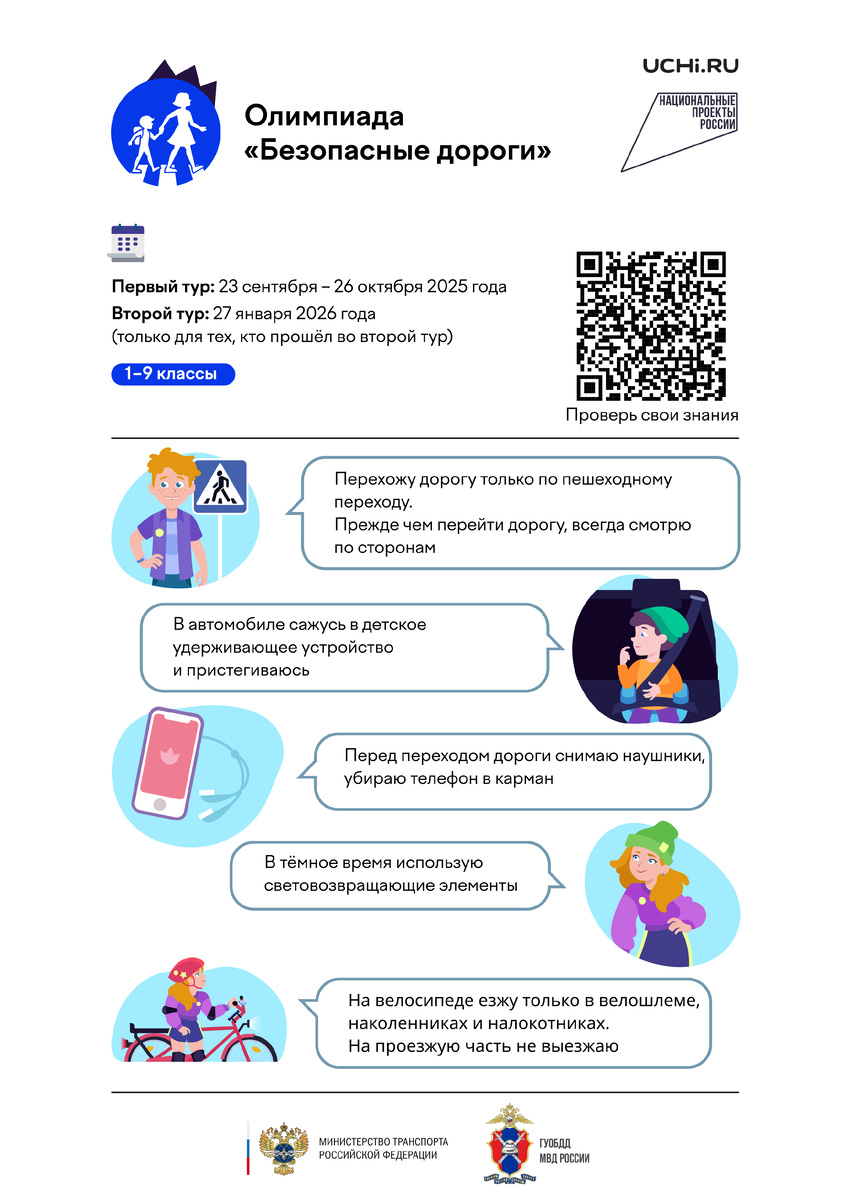 ⚡ Первый тур олимпиады пройдёт с 23 сентября по 26 октября. Мероприятие ориентировано на учеников 1-9-х классов, состоит из заданий с сюжетами про участников дорожного движения и транспорт, не требует углублённых знаний и развивает критическое мышление. Чтобы принять участие в олимпиаде, следует пройти по ссылке https://dorogi.uchi.ru/.