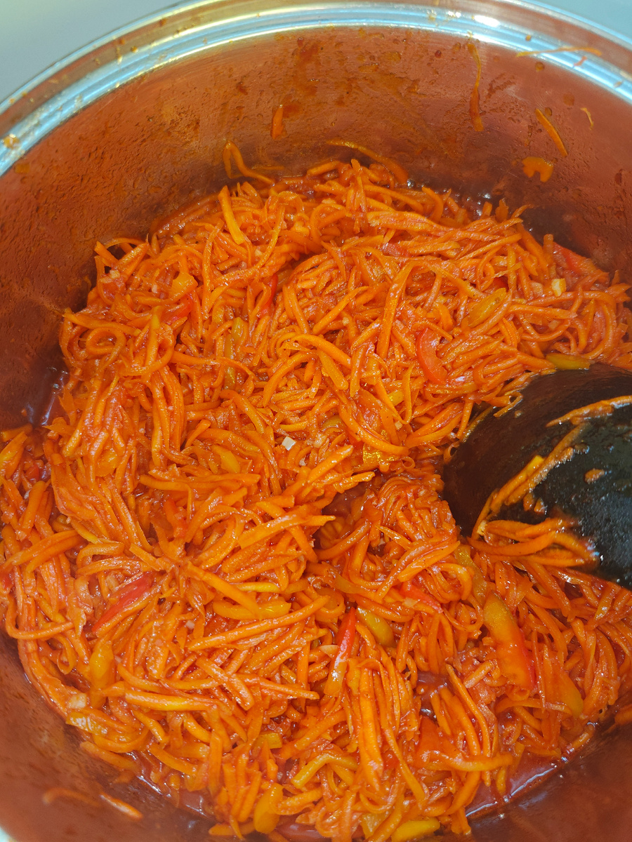 Этот салат из моркови стал открытием для нас, он с лëгкостью может заменить морковь по-корейски. Я люблю морковь по-корейски, а вот варëную морковь я совершенно не люблю. Так, например, Саша и бабушка любят пироги с морковью, а я их совсем не ем, помню только в детском доме иногда готовили пироги с морковью, и я их не ел, пару раз пробовал, но совсем не понравилось.