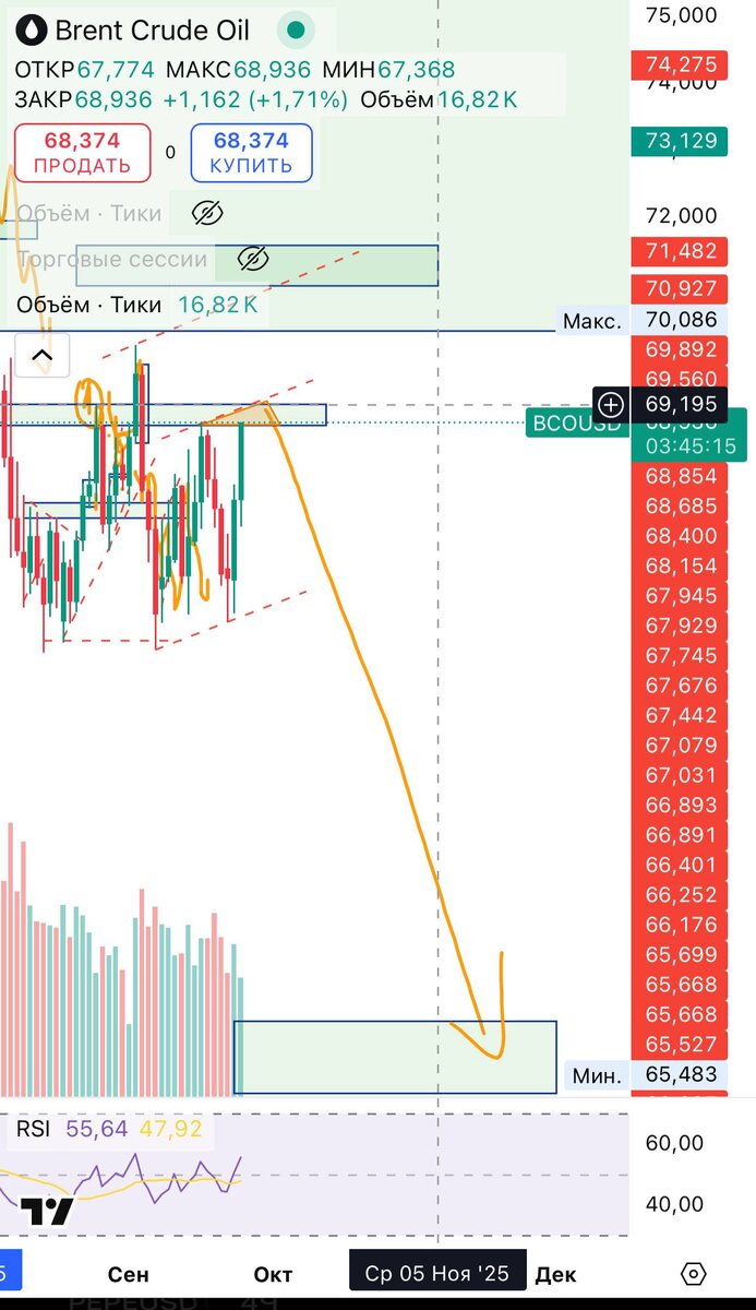 В ответ на пост Нефть. Несмотря на то, что после пролива цены опять поднимаются, я жду новых точек входа для продолжения шорта от 69.2 и план Б - от 70,7. Я лично пока без позиции, но присматриваюсь к ее возврату после фиксации промежуточного профита в пн.
