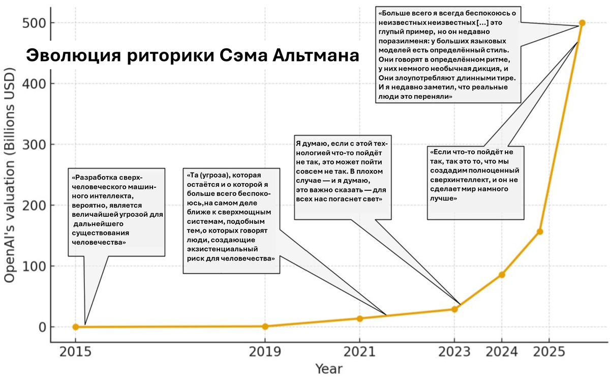 Эволюция страхов Сэма Альтмана Сэм Альтман 10 лет назад так сказал на конференции Airbnb Open Air 2015 в интервью Майку Кёртису: «ИИ, скорее всего, приведёт к концу света, но до тех пор появятся отличные компании». И потом добавил, что: «Если бы я был Бараком Обамой (тогдашним президентом США), то выделил бы около 100 миллиардов долларов на исследования безопасности ИИ». Но ни Обама, ни сменившие его Трамп, Байден и снова Трамп не сделали ничего подобного. Да и сам Альтман сосредоточился вовсе не на безопасности ИИ, а на второй части своего прогноза - создании «отличной компании». Что и было сделано, - достаточно посмотреть на кривую роста оценки стоимости OpenAI за прошедшие 10 лет. Но вот ведь что интересно – как за те же годы менялась риторика Альтмана о том, что его беспокоит при разработке все более мощных ИИ: · от «Разработка сверхчеловеческого машинного интеллекта, вероятно, является величайшей угрозой для дальнейшего существования человечества» в 2015 · до «Больше всего я всегд