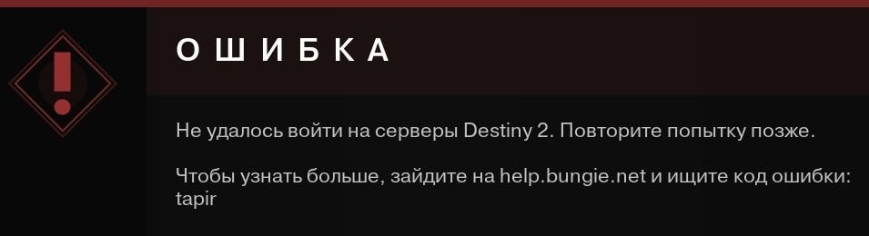 Об ошибке "Tapir" Ошибка Tapir при запуске Destiny 2 обычно указывает на проблему с подключением к серверам игры. Некоторые возможные причины ошибки: