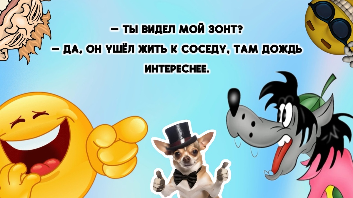1 Врач: — Вам надо меньше есть сладкого. — Но, доктор, у меня душа к сладкому тянется! — Тогда лечите душу отдельно. 2 Муж жене: — Я похудел на три килограмма! — Ты просто носки снял. 3 На уроке: — Вовочка, назови два местоимения. — Кто, я? — Молодец! 4 Жена мужу: — Ты меня слушаешь? — Конечно! — Что я сказала? — Последнее слово? 5 В автобусе: — Мужчина, вы выходите? — Все мы когда-нибудь выходим… 6 — Почему у тебя на лбу синяк? — Хотел сделать «фейспалм», но не рассчитал силу. 7 — Ты где работаешь? — На заводе. — А чем занимаешься? — Сплю на совещаниях. 8 Мама: — Почему у тебя нос грязный? — Я вдохновлялся черепахой-ниндзя! 9 Сын: — Папа, а ты герой? — Конечно! Я вон маму каждый день терплю. 10 — У вас есть таблетки от смеха? — Есть, но вы точно их не сможете принять серьёзно.