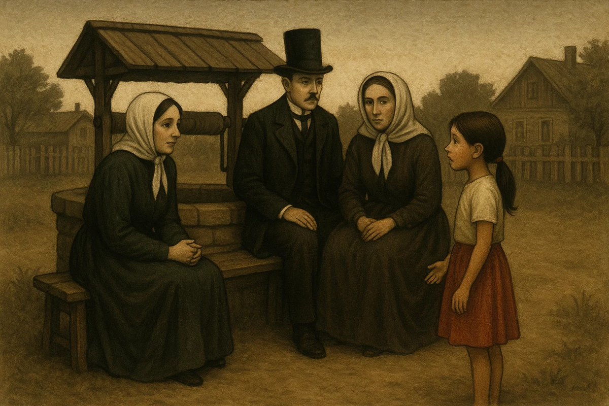 Когда Таня подошла к колодцу, она увидела на лавочке трех человек: двух женщин и мужчину. Они сидели неподвижно, словно статуи, и смотрели куда-то вдаль. Таня никогда раньше их не видела, что было странно для маленького поселка, где все друг друга знали. Женщины были одеты в длинные платья, закрытые до самого горла, с тяжелыми шалями на плечах. У одной из них на голове был чепец, аккуратно скрывающий волосы, а у другой волосы были туго стянуты в пучок. Мужчина выглядел еще более необычно: на нем был старомодный пиджак, узкие брюки, а на голове — цилиндр, как будто он шагнул прямиком из старой фотографии XIX века.