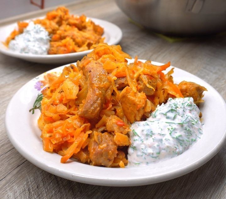 Это блюдо — классика, которая всегда выручает, когда нужно приготовить что-то простое, сытное и очень вкусное. Свиная шея, благодаря своей мягкости и жирности, идеально подходит для тушения. А капуста в сочетании с овощами и ароматными специями превращается в нежный гарнир, пропитанный вкусом мяса и специй. Но главная «фишка» — это соус на основе сметаны, чеснока и аджики, который делает блюдо особенным и насыщенным. Для основного блюда: Для соуса: Сначала займёмся мясом. Свиную шею нарежьте средними кусочками. Разогрейте в глубокой кастрюле или казане немного масла и обжарьте мясо до золотистой корочки. Этот этап важен: мясо должно «запечататься», чтобы оставалось сочным внутри. Морковь нарежьте тонкой соломкой или кружочками, а помидоры — кубиками. Добавьте их к мясу и перемешайте. Помидоры дадут сок, который станет основой для тушения. Теперь очередь капусты. Нашинкуйте её не слишком мелко, чтобы в процессе приготовления она сохранила текстуру. Добавьте к мясу и овощам, перемешайте