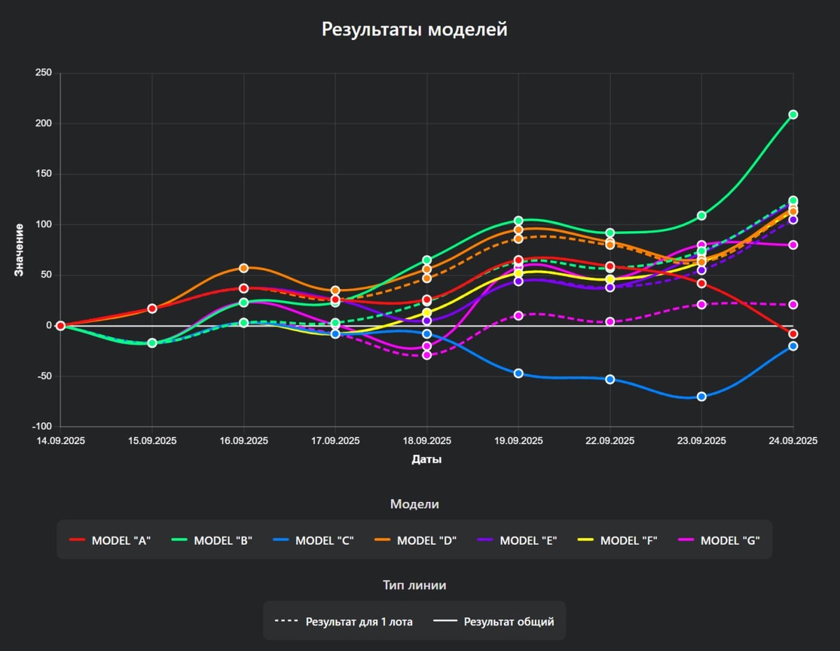 Результаты 15.09-24.09.2025 📅 ┌────────────┬───────┬────────┐ │ Модель │ 1 лот │ Общий │ ├────────────┼───────┼────────┤ │ MODEL "A" │ -8 │ -8 │ │ MODEL "B" │ 124 │ 209 │ │ MODEL "C" │ -20 │ -20 │ │ MODEL "D" │ 113 │ 116 │ │ MODEL "E" │ 105 │ 122 │ │ MODEL "F" │ 113 │ 113 │ │ MODEL "G" │ 21 │ 80 │ └────────────┴───────┴────────┘