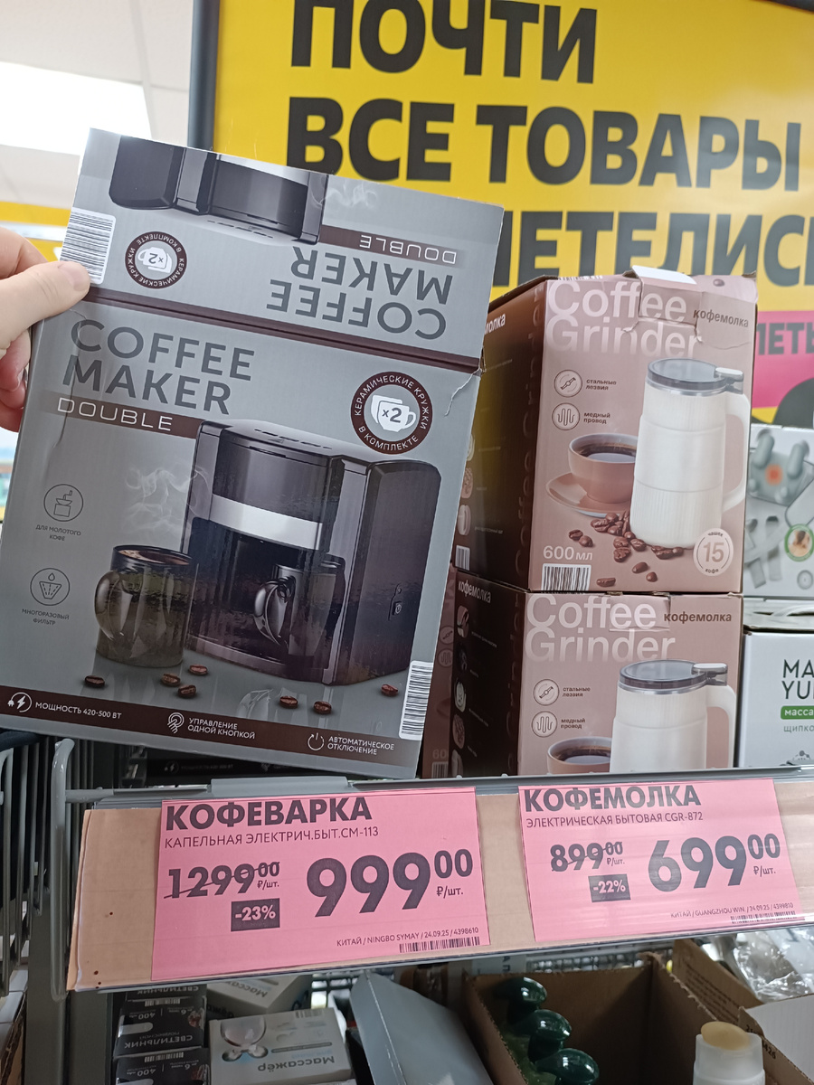 А начну сегодня с парочки позиций из распродажи. Пару недель эти кофеварки и кофемолки были по обычной цене, скидки на них не давали почему-то по прошествии акционной недели по тому каталогу. А вот, сегодня вижу по 23% и 22% скидки, ценники покраснели: