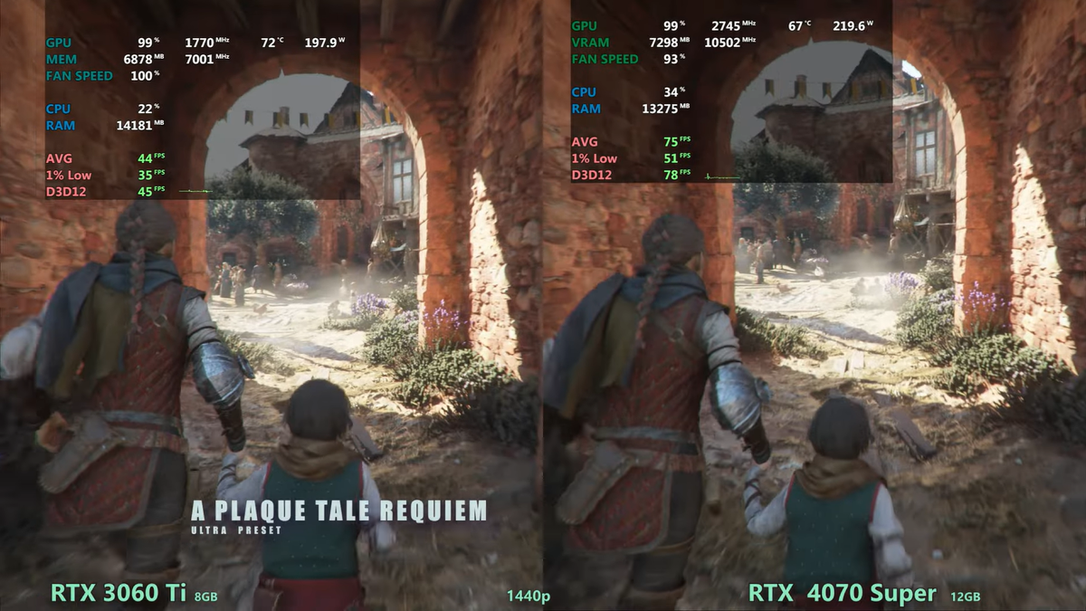 Автор YouTube-канала Odin Hardware продемонстрировал, как в современных играх в 1440р показывают себя RTX 3060 Ti и RTX 4070S. Тестовый стенд включал процессор Intel Core i5-14600K, матплату Asus Prime Z790 с Wi-Fi, систему охлаждения Nzxt Kraken 360, оперативную память 2 x 16 ГБ DDR5 6000 МГц, видеокарту Zotac Twin Edge RTX 3060 Ti 8 ГБ DDR6 с двумя вентиляторами/Gigabyte Windforce RTX 4070 Super 12 ГБ DDR7 с двумя вентиляторами. A Plague Tale Requiem шла с ультра-пресетом. Средняя частота кадров в ней составляла 43 к/с (3060 Ti) и 75 к/с (4070S). В Cyperpunk с RT Off и пресетом Ultra в среднем удалось получить 57 к/с (3060 Ti) и 80 к/с (4070S). God of War запускалась с ультра-графикой. Средняя производительность в этой игре находилась в районе 64 к/с (3060 Ti) и 114 к/с (4070S). Игра The Witcher 3 тестировалась на настройках графики High и с RT Off. Средний FPS составил в ней 87 к/с (3060 Ti) и 137 к/с (4070S). Baldur's Gate шла с графикой Ultra. Средняя частота кадров в ней равнялас