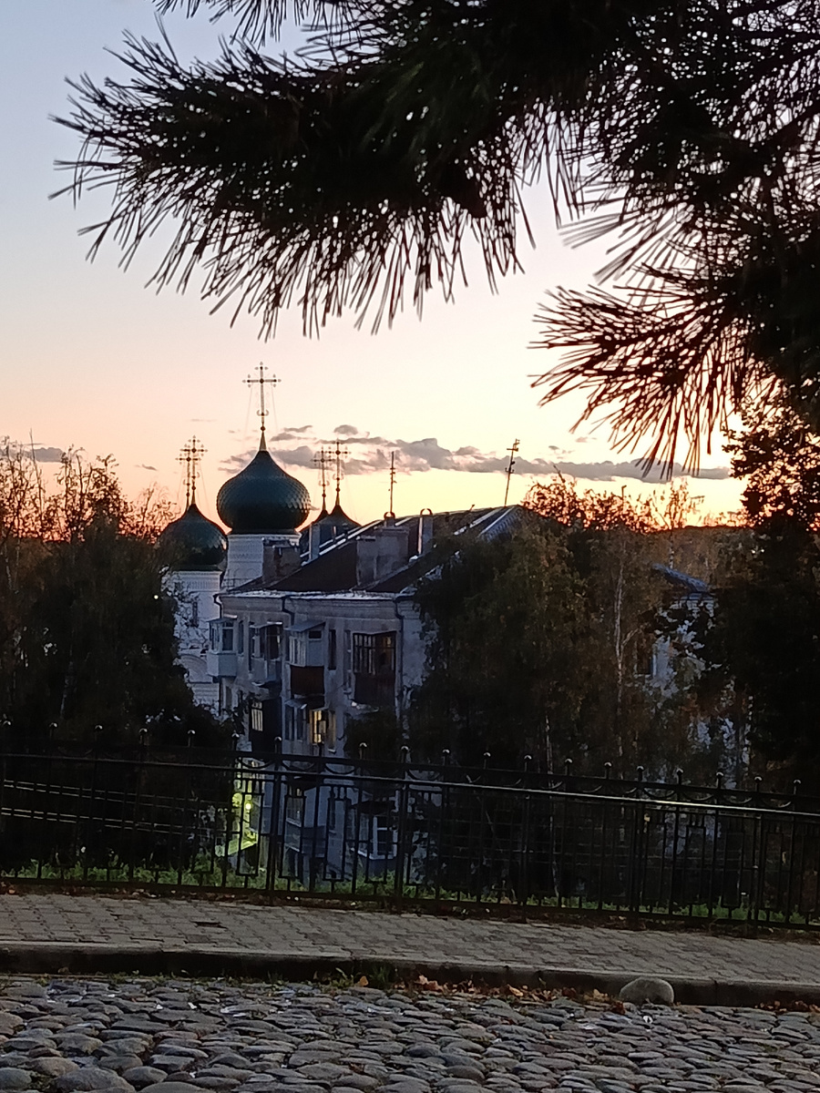 Вечера осенью перестали быть томными. Нет расслабляющей жары, долгого сентиментального предзакатья и длинных медленных прогулок. А ходьба необходима, мы ведь стараемся жить активно, полезно и продвигаться в сторону стройности, да? Выходя после работы на крыльцо музея, я вижу лишь прощальный луч солнца золотого... ...который ещё немного озаряет архитектуру, если смотреть со светилом в одном направлении, как и положено в дружной семье. Пока не накрыл нас зимний мрак (тогда станет не до выбора – иди, где есть фонари и расчищены сугробы), пока можно варьировать маршруты, спешу разнообразить свои проходочки. Расскажу об одном вечере когда-то в конце сентября, где-то в Костроме. И раскрою свои секретики интересных прогулок. Как бы вы не спешили, зрение работает, примечаются окрестности, общие виды, детали. Несложно подключить воображение, ассоциации – и вот вы уже в выставочных залах. Нежно-акварельно над Волгой. Сумрачно-графично в скверах. Скудное освещение делает автопортрет моложе, и эт