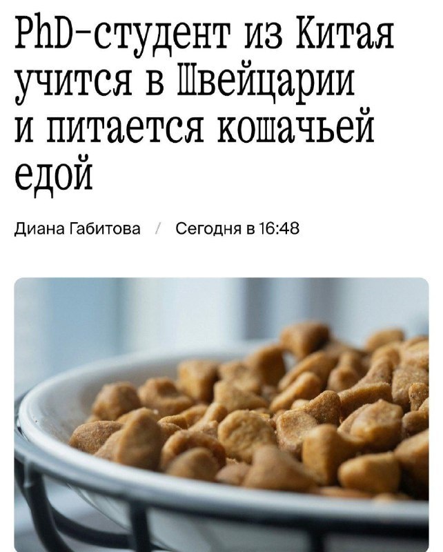 Знаете, чем гранит науки отличается от кошачьего корма? Практически ничем, если вы студент в Швейцарии. Говорят, грызть его одинаково трудно, но во втором варианте, как выясняется, куда больше белка. А это, согласитесь, весомый аргумент в академических спорах о правильном питании. ## Швейцарский гамбит: меню чемпиона В то время как обычные туристы в Швейцарии падают в обморок от цен на фуникулёр и чашечку капучино, а местные миллионеры томно выбирают между винтажным «Петрюсом» и коллекционным «Романе-Конти», где-то в университетском кампусе разворачивается настоящая драма духа и желудка. Наш герой — студент из Китая, юный Конфуций от мира финансов и будущий титан науки, который нашел поистине дзен-буддистский подход к выживанию в одной из самых дорогих стран мира. Пока его сокурсники жалуются на то, что авокадо-тост подорожал на целый франк, наш отважный азиатский друг совершил прорыв в области диетологии и личной эффективности. Он смотрит на жизнь, как на шахматную партию, где каждый