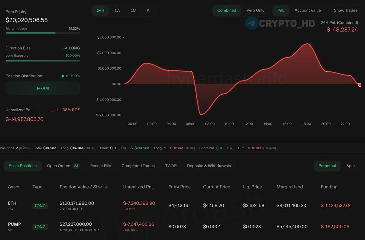 🙁 Трейдер Machi Big Brother потерял более $14,000,000 (unrealized) на своих лонгах по ETH и PUMP